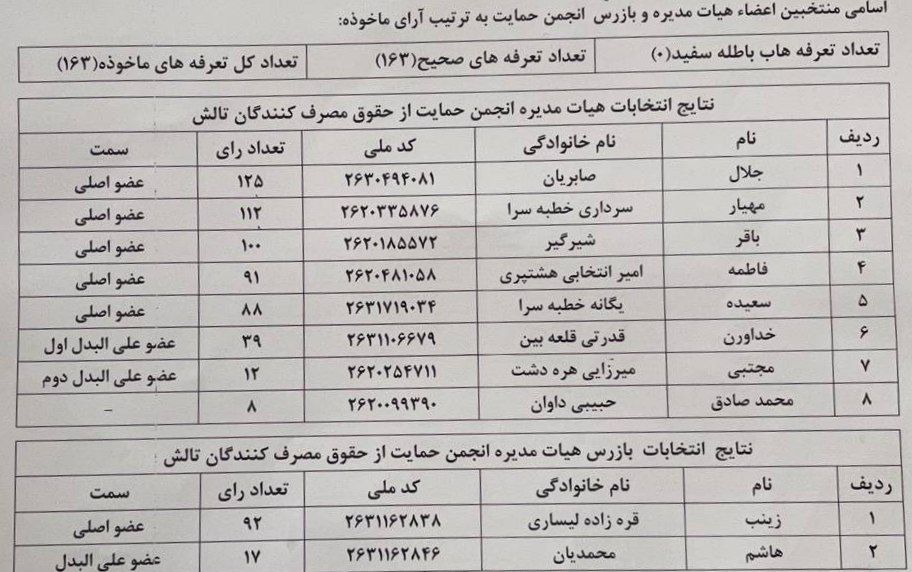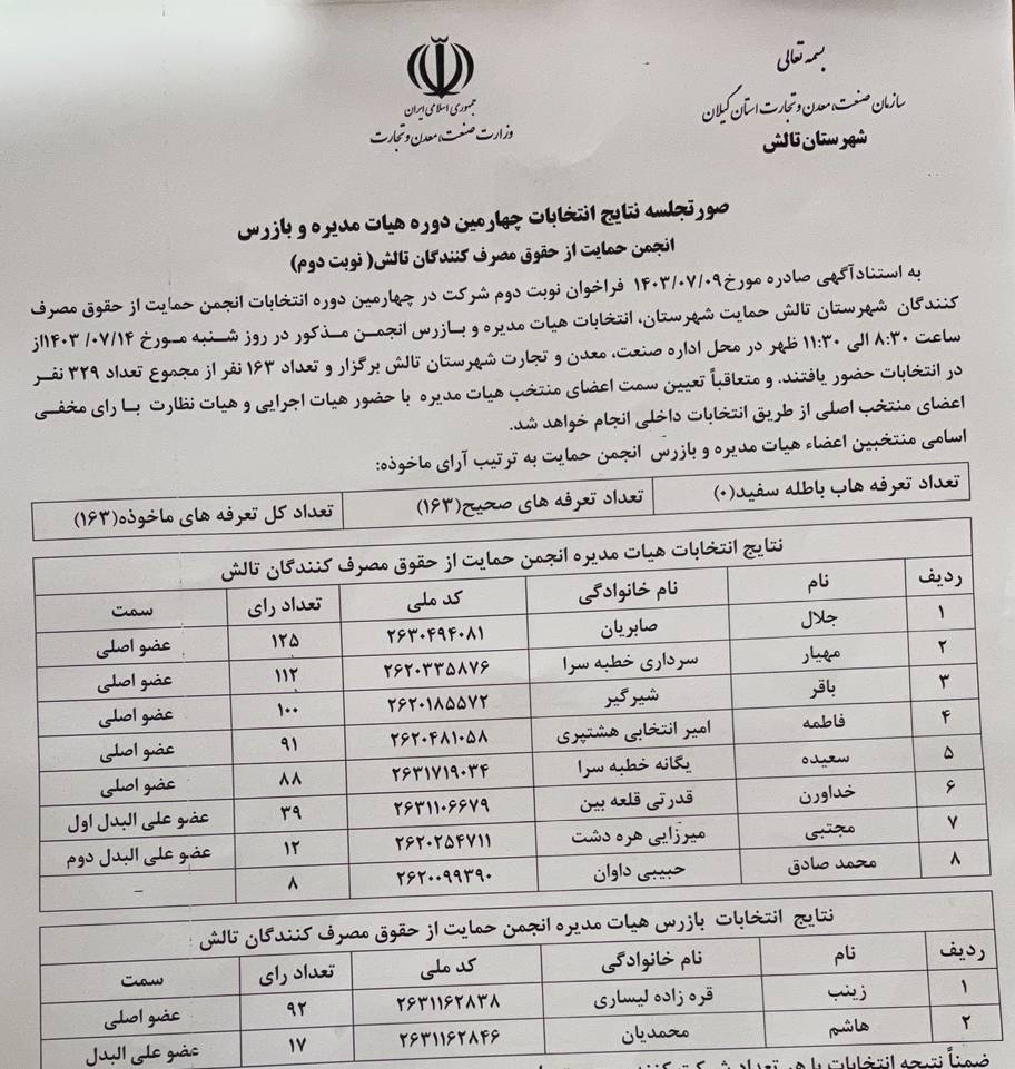 نتایج انتخابات هیات‌مدیره انجمن حمایت از حقوق مصرف‌کنندگان شهرستان تالش به شرح ذیل مشخص شد: