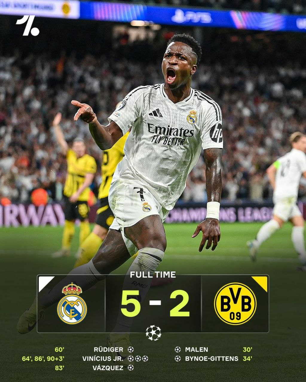وینیسیوس جونیور دو گل دیگر زد تا کامبک را با چاشنی هتریک به نفع رئال‌مادرید بازگرداند. رئالی‌ها با این برد ۴۴مین‌‌ بازی بدون باخت خود را پشت سر گذاشتند و صوت پایان مسابقه حساس بین دو تیم بالای جدولی، ۵ بر ۲ به نفع رئال‌مادرید به صدا درآمد.