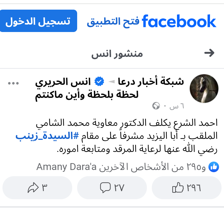 شبکههای اجتماعی سوریه از منصوب شدن شخصی به نام معاویه محمد الشامی به عنوان مشرف بر مرقد حضرت زینب(ع) خبر دادند!