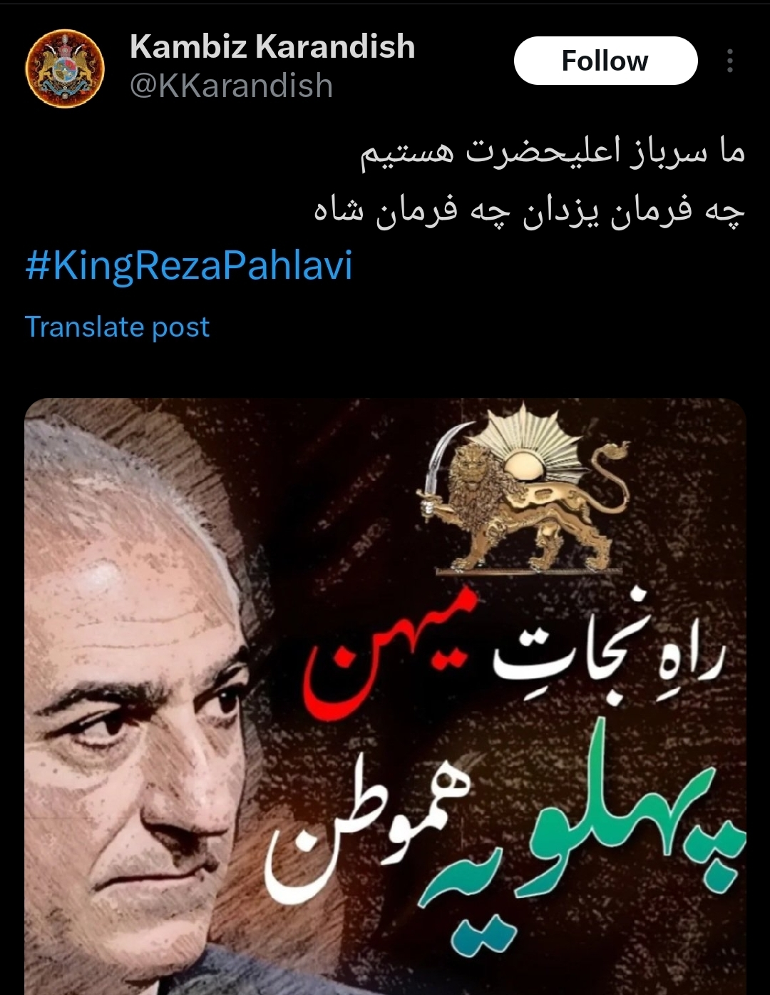 کاراندیش که خود را سرباز پهلوی می‌خواند، در پیامی گفته بود دوست دارد همه مخالفان او را از بین ببرد.