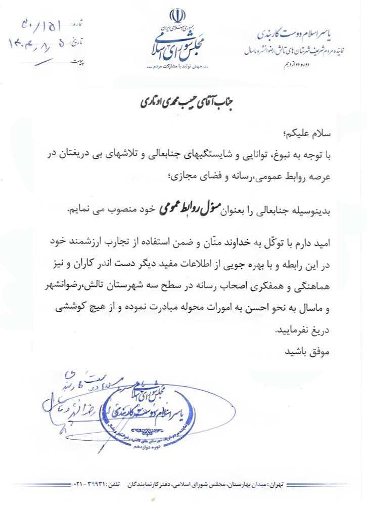 با حکم دکتر یاسر اسلام‌دوست، نماینده مردم شریف شهرستان‌های تالش، رضوانشهر و ماسال در مجلس شورای اسلامی، آقای حبیب محمدی اوتاری به عنوان مسئول روابط عمومی نماینده در حوزه انتخابیه منصوب شد. محمدی از فعالان جوان، تحصیل‌کرده و آشنا با حوزه رسانه و ارتباطات اجتماعی است.